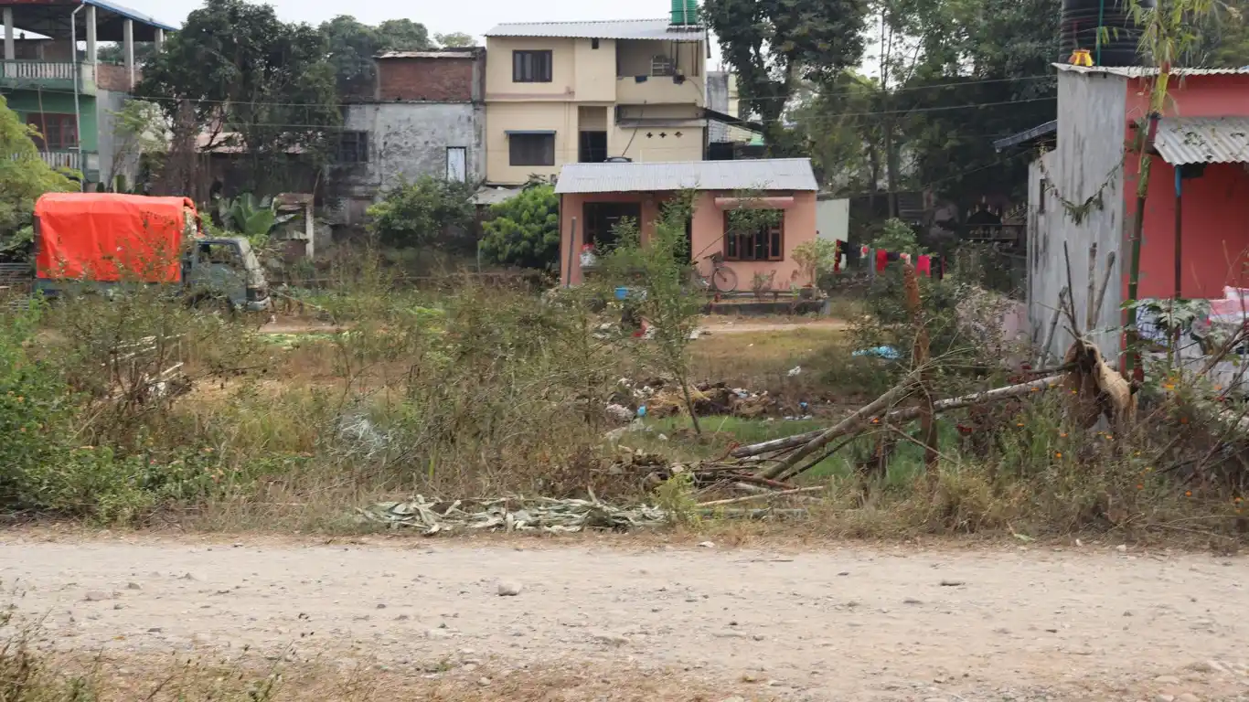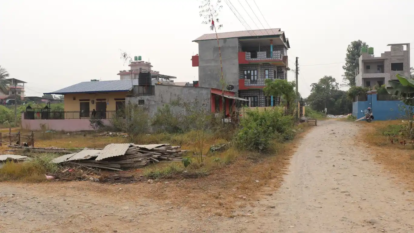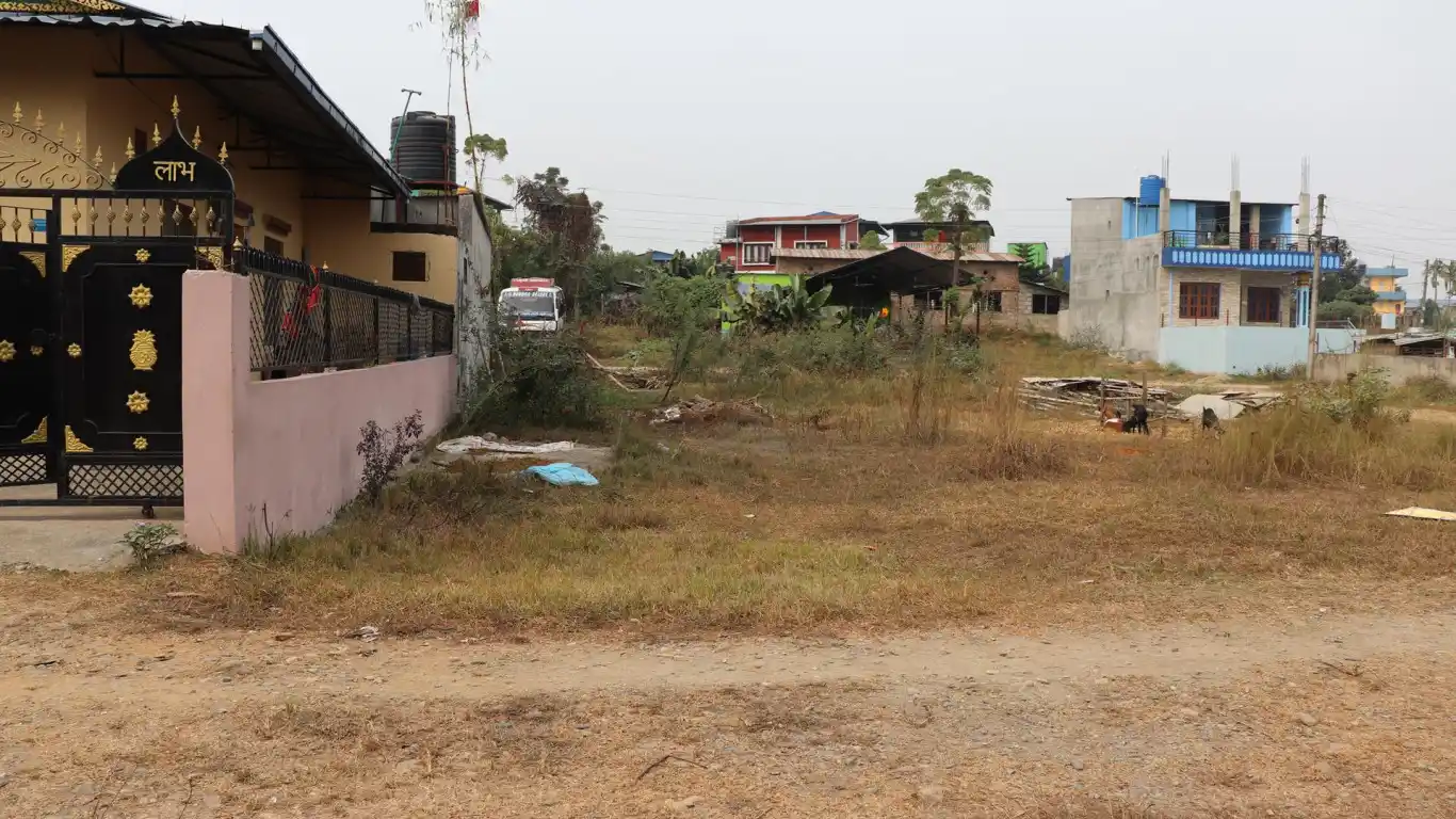Prime 14 dhur North-South facing residential land at Bhagwati Tole, Bharatpur Mahanagarpalika-04, Chitwan. Located 1100 meters West from 24 Kothi, near Trichowk. Features 20 haat mohada and 56 haat pichhad with 6 meter graveled road access. Perfect for residential development with all essential facilities available.